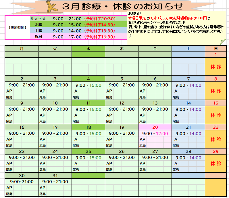 きりん鍼灸整骨院の3月の予定をお知らせ致します(^^♪この度、水曜日限定で電気をかけながらマッサージを行うハンドパルスという施術を、