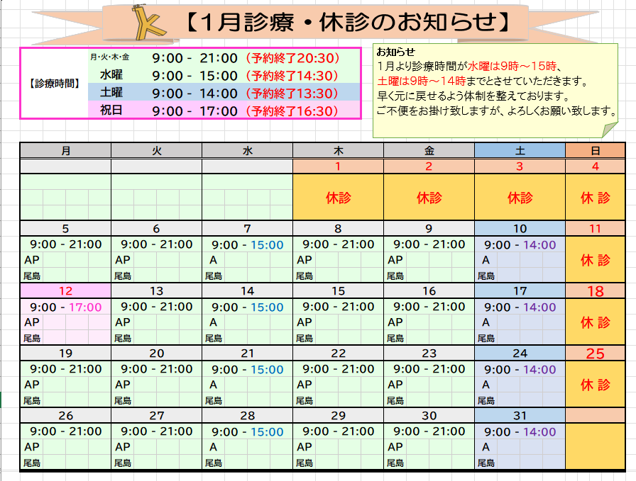 1月のスケジュールをお知らせ致します。1月から診療時間が水曜は9時~15時(最終受付14時半)