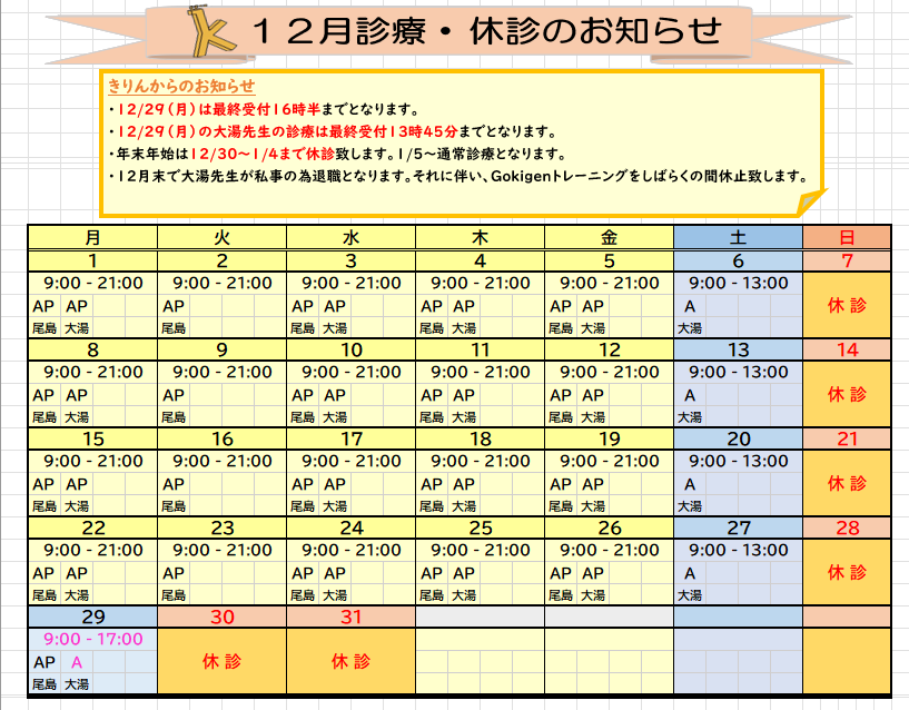 12月はお知らせが沢山あります。・12/29(月)は最終受付16時半までとなります。